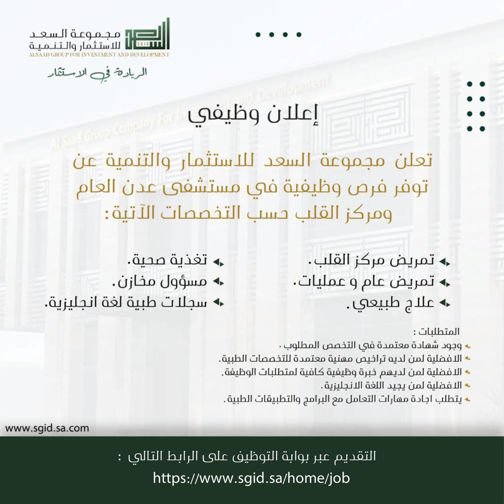 :تعلن مجموعة السعد للاستثمار والتنمية عن توفر فرص وظيفية في مستشفى عدن العام ومركز القلب